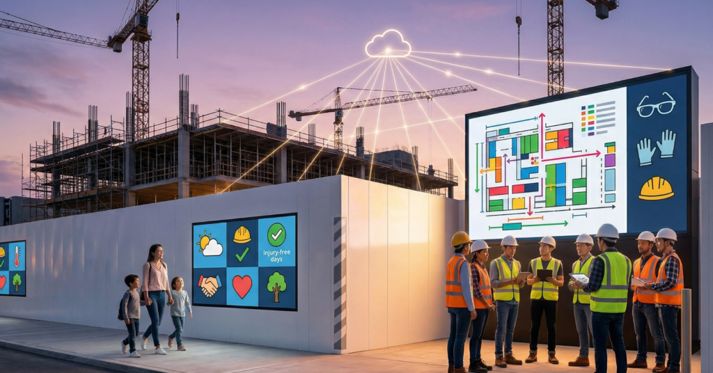大型モニターを搭載した朝礼看板や、地域住民への情報配信のための仮囲いモニターなどに、